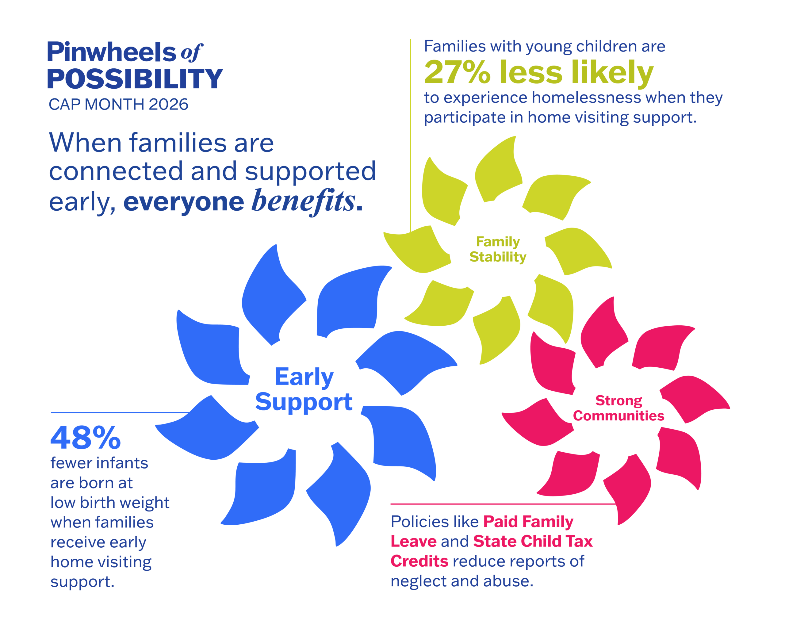 Right now, many families are navigating rising costs, heightened stress, and widening gaps in support. Pinwheels of Possibility celebrates the limitless potential of children and families when communities, systems, and policies come together to keep families strong before a crisis occurs. Together, we can strengthen families at every turn and ensure every child has the chance to grow up safe, supported, and loved.